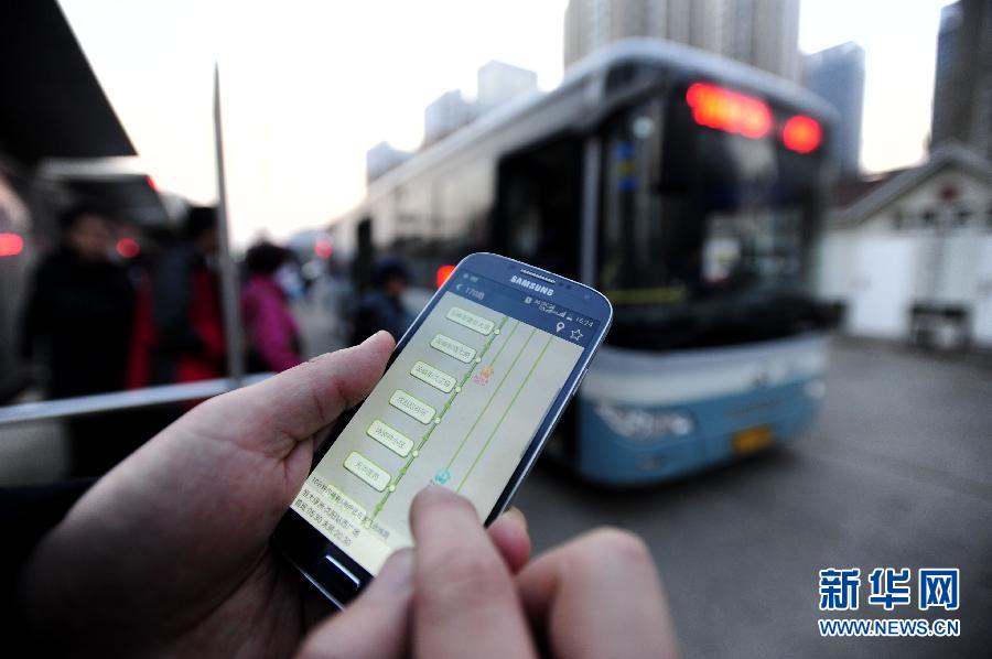 11月17日,在沈阳170路公交车站点,一名市民使用“掌上公交”查询下一辆公交车到达时间。日前,一款名为“车等我——沈阳公交通”的公交实时查询软件正式上线运行,这款软件可以提供出发地与目的地之间的公交换乘信息,还可以查询公交线路、站点距离、公交车到站时间等,方便市民出行。新华社发(张文魁 摄)