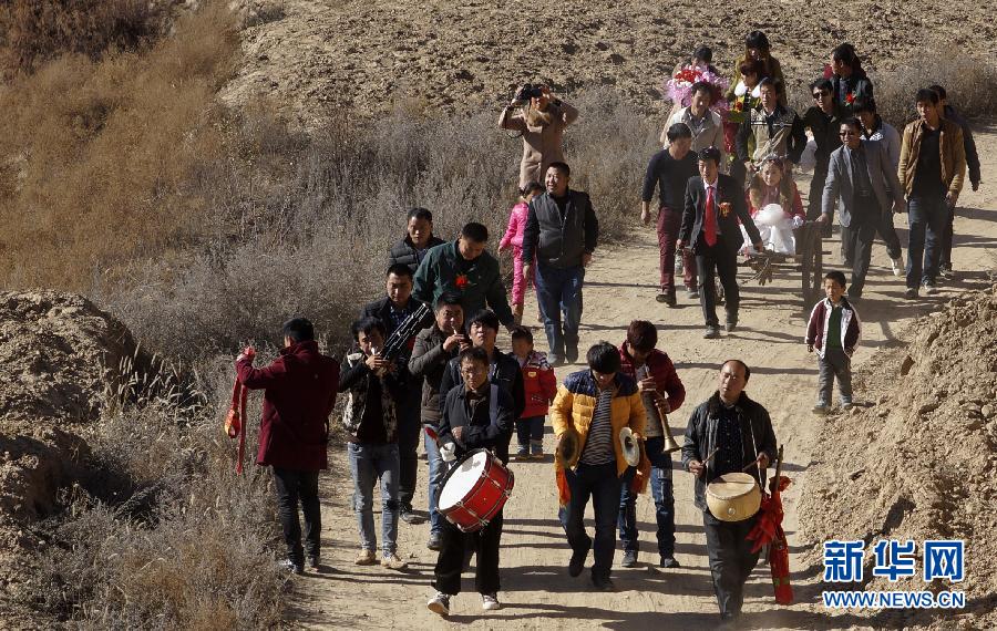 新郎吴旗用板车迎娶新娘冯盼(11月16日摄)。当日,陕西省子洲县周家硷镇洼焉村举行了一场别致的迎新人仪式,新郎拉着端坐在板车上的新娘,由乡亲们簇拥着走向新生活。 新华社发(栾武生摄)