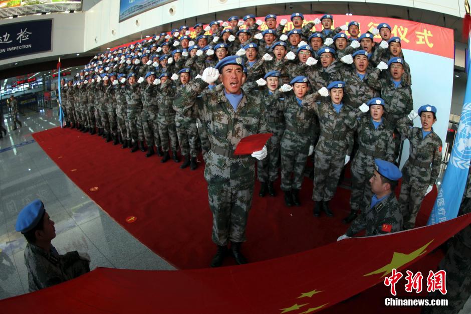 11月18日,中国第十三批赴南苏丹(瓦乌)维和部队第一梯队100名官兵,从济南遥墙机场出发飞赴任务区,执行为期8个月的维和任务。此次维和任务共派出331人,将主要部署在南苏丹西加扎勒河州首府瓦乌市,担负任务区内的道路、桥梁、机场和供水、供电设施的修建与维护,销毁武器弹药等任务。图为宣誓仪式。中新社发 仇成梁 摄