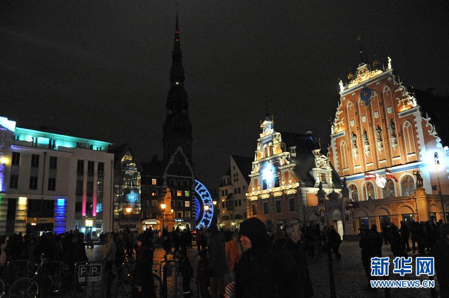 11月16日,人们在拉脱维亚首都里加欣赏灯光秀。新华社记者郭群摄