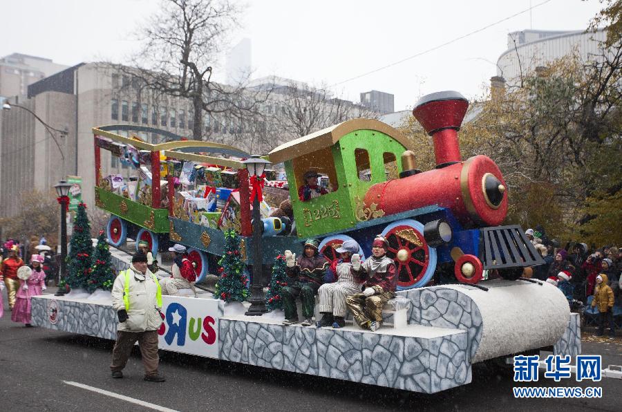 11月16日,在加拿大多伦多,一辆以玩具火车为主题的花车在游行中亮相。当日,加拿大多伦多举行第110届圣诞大游行,21支乐队、31辆花车及数千人的游行队伍吸引了众多观众观看。 新华社发(邹峥摄)