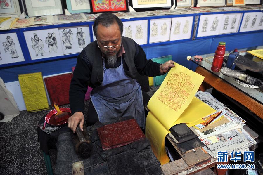 11月16日,山西省新绛县民间艺人吴百锁在手工印制木版年画。吴百锁说。新华社记者 王飞航 摄