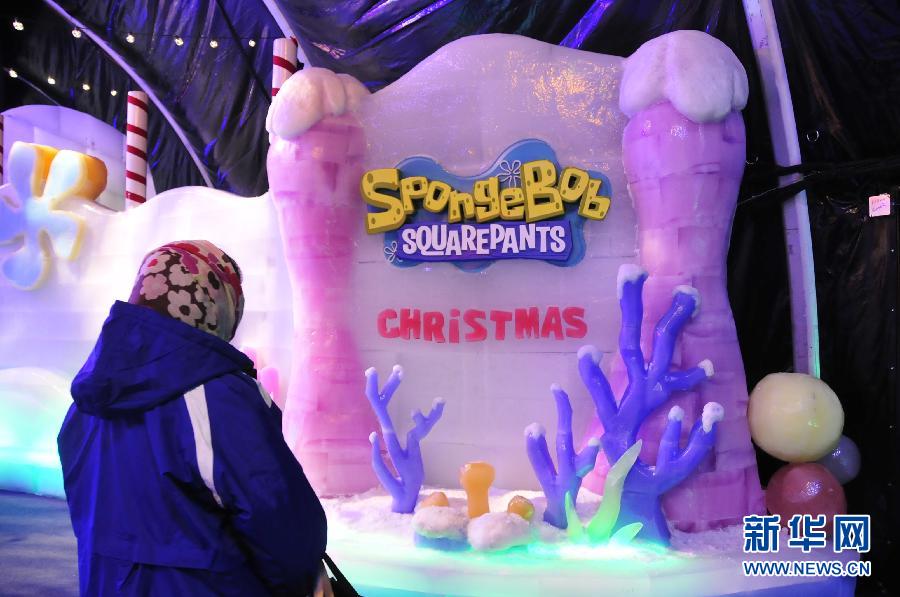 11月14日,在美国得克萨斯州南部加尔维斯顿岛上的穆迪花园,参观者欣赏冰雕作品。中国冰雕当天在美国得克萨斯州南部加尔维斯顿岛上的穆迪花园惊艳亮相。这次冰雕展主题为“冰雪海岛”——海绵宝宝,由来自中国哈尔滨的31位冰雕大师用45天,将6000多块总重量为900吨的冰雕刻成50多件美轮美奂的艺术作品。新华社记者张永兴摄