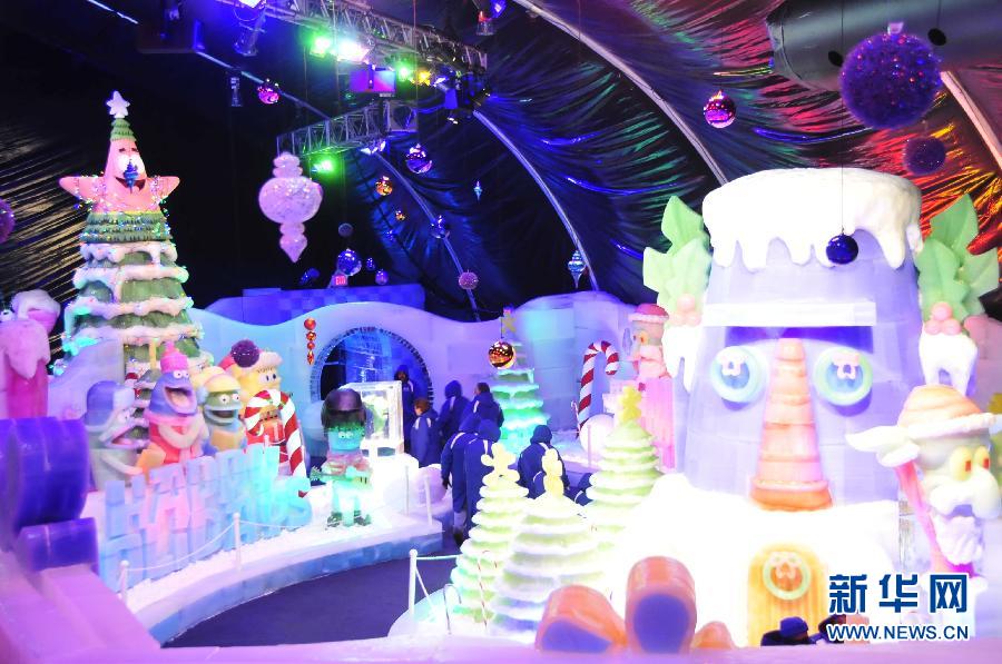 这是11月14日在美国得克萨斯州南部加尔维斯顿岛上的穆迪花园拍摄的冰雕展现场。中国冰雕当天在美国得克萨斯州南部加尔维斯顿岛上的穆迪花园惊艳亮相。这次冰雕展主题为“冰雪海岛”——海绵宝宝,由来自中国哈尔滨的31位冰雕大师用45天,将6000多块总重量为900吨的冰雕刻成50多件美轮美奂的艺术作品。新华社记者张永兴摄