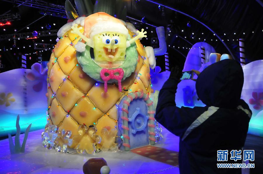 11月14日,在美国得克萨斯州南部加尔维斯顿岛上的穆迪花园,参观者拍摄冰雕作品。中国冰雕当天在美国得克萨斯州南部加尔维斯顿岛上的穆迪花园惊艳亮相。这次冰雕展主题为“冰雪海岛”——海绵宝宝,由来自中国哈尔滨的31位冰雕大师用45天,将6000多块总重量为900吨的冰雕刻成50多件美轮美奂的艺术作品。新华社记者张永兴摄