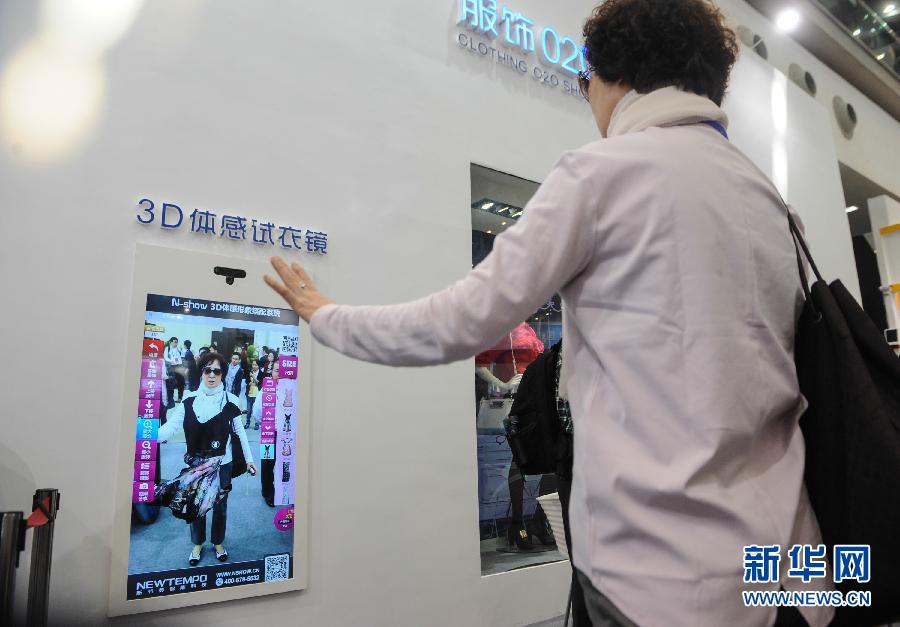 11月16日,一名观众使用NSHOW3D体感试衣镜。当日,第十六届中国国际高新技术成果交易会(高交会)在广东深圳开幕。本次高交会以“坚持创新驱动,加快绿色发展”为主题,总展览面积超过11万平方米,有50多个国家和地区的100多个代表团、3000多家参展商、1万多个项目参加展示、交易和洽谈。新华社记者 毛思倩 摄