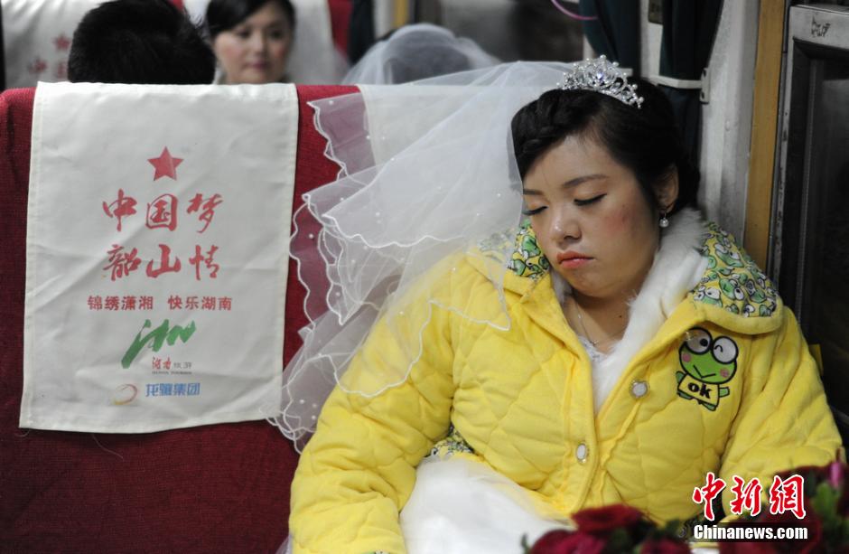 11月16日清晨,来自中国各地的50对新人乘坐“韶山一号”火车,从长沙赴毛泽东故里韶山举行集体婚礼,宣誓他们的爱情。“韶山一号”作为中国区间运行票价最便宜的列车之一,已运行半个多世纪。从长沙到韶山,全程2小时45分钟,票价9.5元。 杨华峰 摄