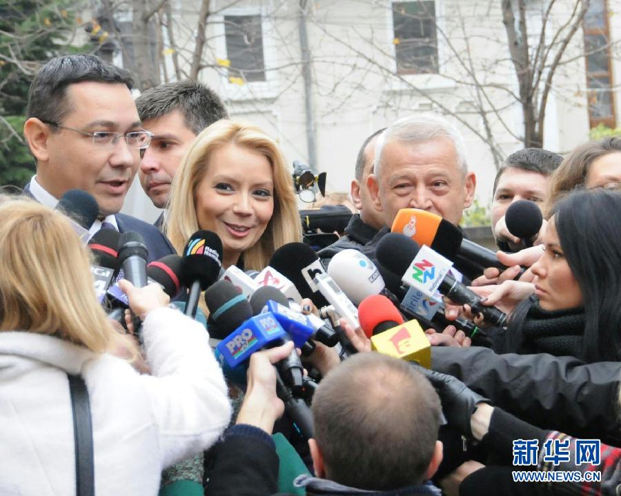 11月16日,在罗马尼亚首都布加勒斯特,执政联盟三党候选人、现任总理蓬塔(左一)回答记者提问。当天,罗马尼亚举行总统选举第二轮投票,执政联盟三党候选人、现任总理蓬塔将与民主基督联盟候选人、锡比乌市长约翰尼斯角逐总统职位。投票于当地时间7时开始,至21时结束。全国近1830万选民将在本土18550个投票站和海外294个投票站选举他们未来5年的国家最高领导人。新华社记者林惠芬摄