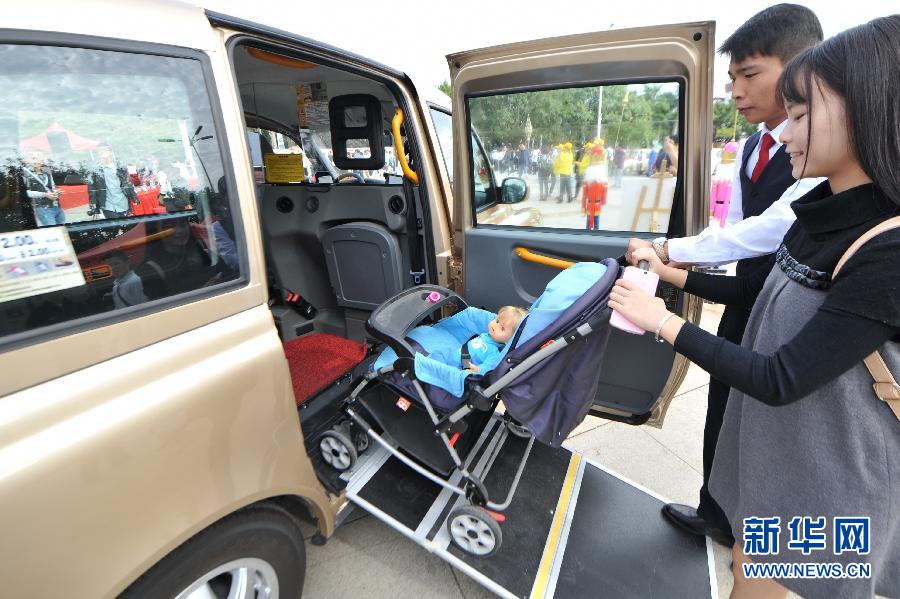 11月16日,工作人员通过英伦TX4电召车轿厢右侧的一块拉伸至地面的踏板将婴儿手推车推进车内。当日,香槟金色的英伦TX4电召车在美丽的“鹭岛”福建厦门上路。这款经典的“老爷车”源自英国“伦敦黑色出租车”,不仅外形保留古典风范,而且内部空间更具宽敞、私密、人性化无障碍设计等优点;该车使用油气混合动力设计,节能环保;车内配有空气净化器、免费WIFI等。据介绍,厦门这种“上门”为乘客提供“点到点”服务的电召出租车服务模式,在福建省尚属首创。 新华社记者 林善传 摄