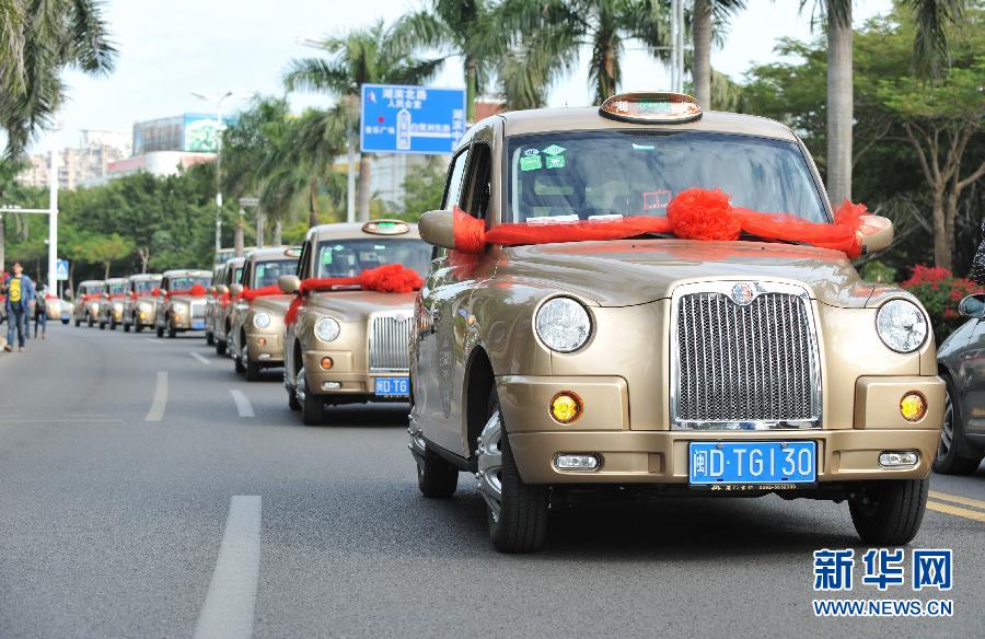 11月16日,香槟金色的英伦TX4电召车成为厦门一道靓丽的风景线。当日,香槟金色的英伦TX4电召车在美丽的“鹭岛”福建厦门上路。这款经典的“老爷车”源自英国“伦敦黑色出租车”,不仅外形保留古典风范,而且内部空间更具宽敞、私密、人性化无障碍设计等优点;该车使用油气混合动力设计,节能环保;车内配有空气净化器、免费WIFI等。据介绍,厦门这种“上门”为乘客提供“点到点”服务的电召出租车服务模式,在福建省尚属首创。 新华社记者 林善传 摄