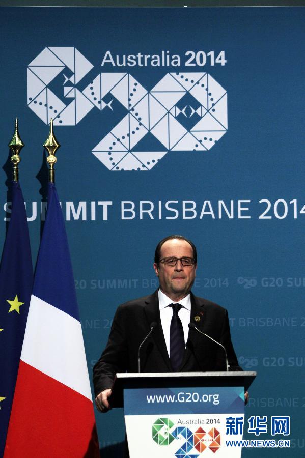11月16日, 法国总统奥朗德在澳大利亚布里斯班出席G20峰会记者会。 新华社记者 金林鹏 摄