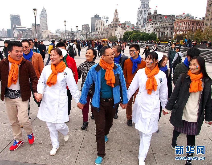 11月16日,一些医务工作者和治愈后的皮肤病患者在上海街头手拉手同行。当日,宅医送全国公益联盟携上海江城皮肤病医院发起的“重症皮肤病患者关爱行动”正式启动,志愿者们以街头“快闪”方式推行公益项目的开展,帮助重症皮肤病患者重拾生活信心。新华社记者 陈飞 摄