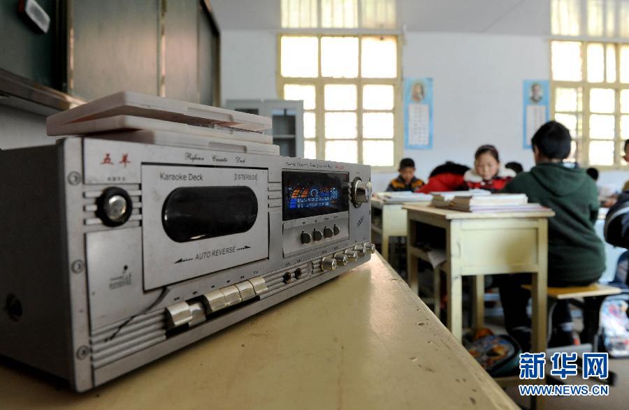 11月14日,河南省嵩县车村镇佛坪小学的学生们用录音机听英语听力磁带。在河南省嵩县车村镇,有一所仅有30余名学生的“麻雀小学”——佛坪小学,教职员工只有申德智、李娟娟夫妻两人和一名代课教师。佛坪小学位于伏牛山区,地处偏远,条件艰苦,很多教师都不愿到这里任教。申德智是本村人,也曾是这所学校的学生。大学毕业后原本在镇里中学任教的他自愿回村,还带动妻子李娟娟放弃原有工作,来此任教。佛坪小学的30余名学生,从学前班到小学四年级,分散在两个教室内上课,申德智和李娟娟几乎承担了所有学科的教学任务,同时也肩负着照顾住校孩子们日常生活的责任。新华社记者李安摄
