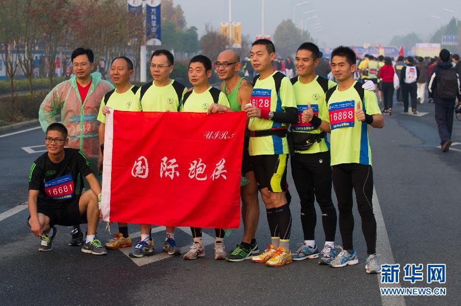 11月16日,参赛选手赛前合影留念。当日,2014合肥国际马拉松赛在合肥市渡江战役纪念馆开跑,共有来自21个国家及地区的逾万名选手参加4个项目的角逐。 新华社记者杜宇摄