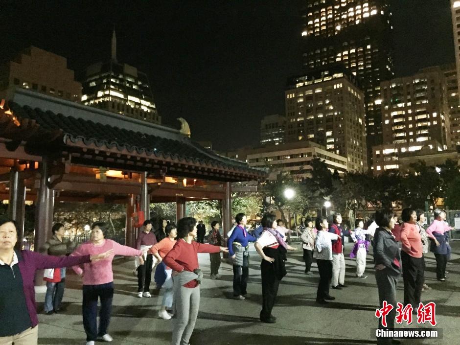 当地时间11月15日夜,美国旧金山中国城花园角广场,华裔大妈热跳广场舞。中新社发 刘丹 摄