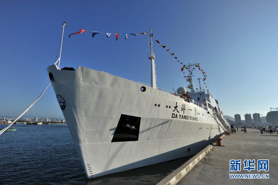 当日,执行我大洋科考第34航次任务的“大洋一号”船从海南三亚起航。据悉,大洋34航次计划时间219天,航程约2万海里,分5个航段,预计2015年6月22日返回青岛,将在我国硫化物勘探区进行多金属硫化物资源勘探、环境基线调查、生物资源调查以及在印度洋海盆进行稀土资源侦查性调查等科学考察。新华社发(杨冠宇 摄)