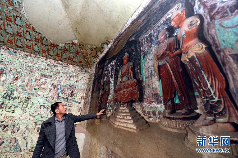 11月15日,浙江大学副教授刁常宇在解说敦煌220窟的复制窟上的佛像壁画。 11月12日,浙江大学文化遗产研究院科技考古中心团队宣布,他们利用高科技数字技术历时4年,仿真重建的敦煌220号石窟成功完成。该复制窟以1∶1的比例尺寸,石窟形制按三维数据在实验室里精确重建。壁画采用宣纸喷绘,附于泥底地仗层上,最大程度还原了原窟的色彩与质感。新华社记者 王定昶摄