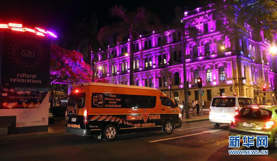 这是11月15日在澳大利亚布里斯班拍摄的夜景。当日,二十国集团领导人第九次峰会在澳大利亚布里斯班举行。入夜,布里斯班街头部分建筑披上了彩色的“外衣”。 新华社记者赵丹惠摄