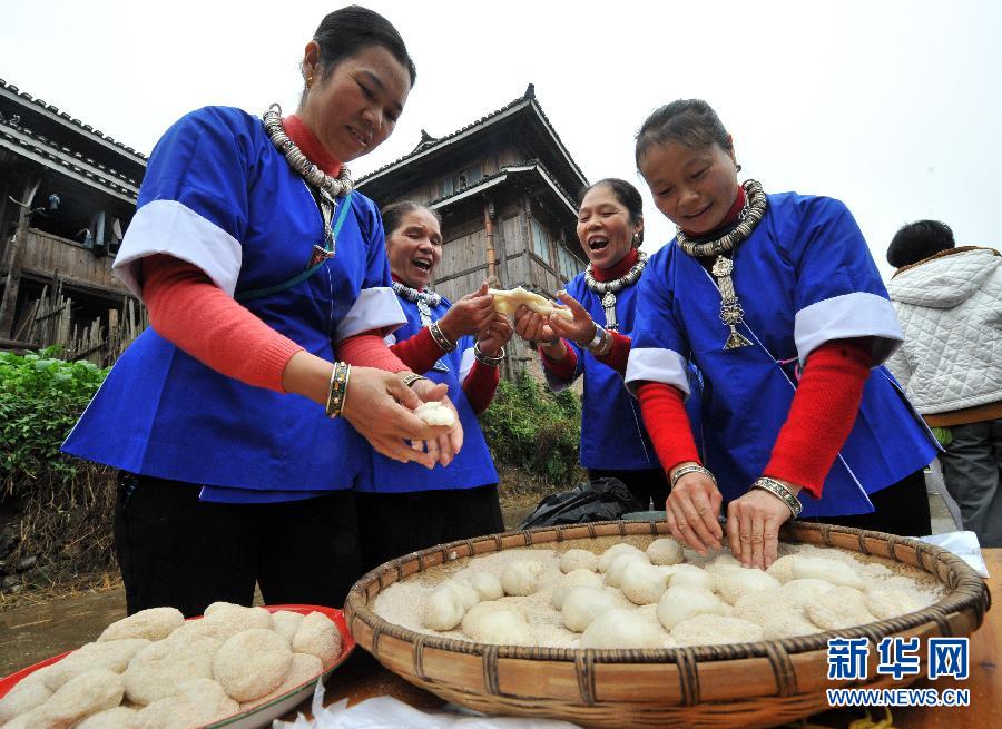 11月15日,在广西三江侗族自治县林溪乡平岩村平寨屯,侗族妇女在做“糍粑”。当日,在广西三江侗族自治县林溪乡平岩村平寨屯,侗族群众传统民俗“捶糍粑”吸引众多游客观看、体验。第十一届中国(柳州·三江)侗族多耶节暨第三届中国大桂林·桂湘原生态民族风情节于11月15日至16日在三江举行。新华社记者 李斌 摄