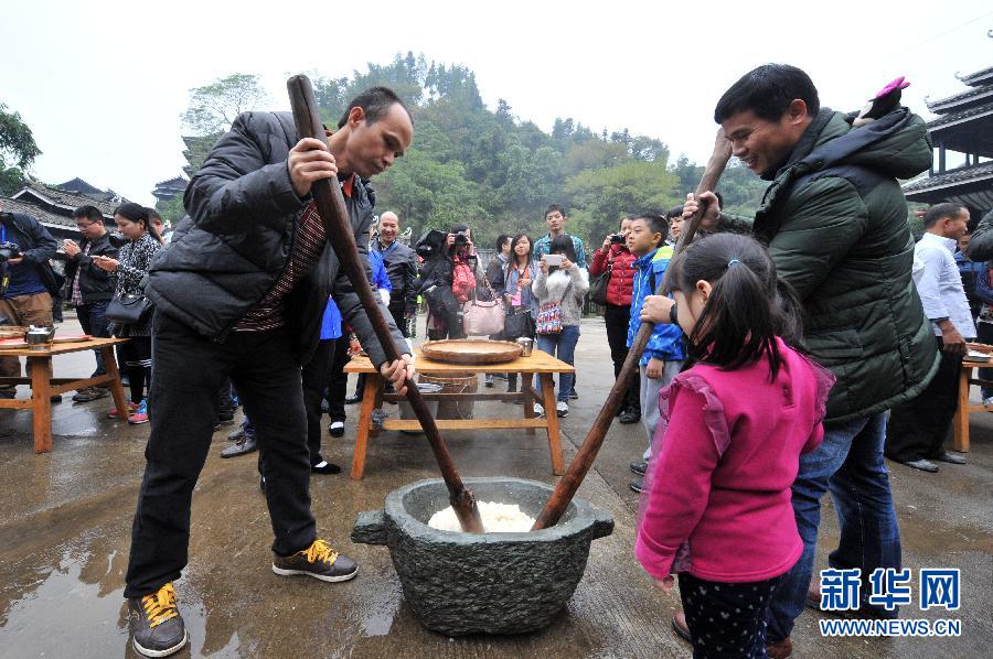 11月15日,在广西三江侗族自治县林溪乡平岩村平寨屯,两名游客参与“捶糍粑”。当日,在广西三江侗族自治县林溪乡平岩村平寨屯,侗族群众传统民俗“捶糍粑”吸引众多游客观看、体验。第十一届中国(柳州·三江)侗族多耶节暨第三届中国大桂林·桂湘原生态民族风情节于11月15日至16日在三江举行。新华社记者 李斌 摄