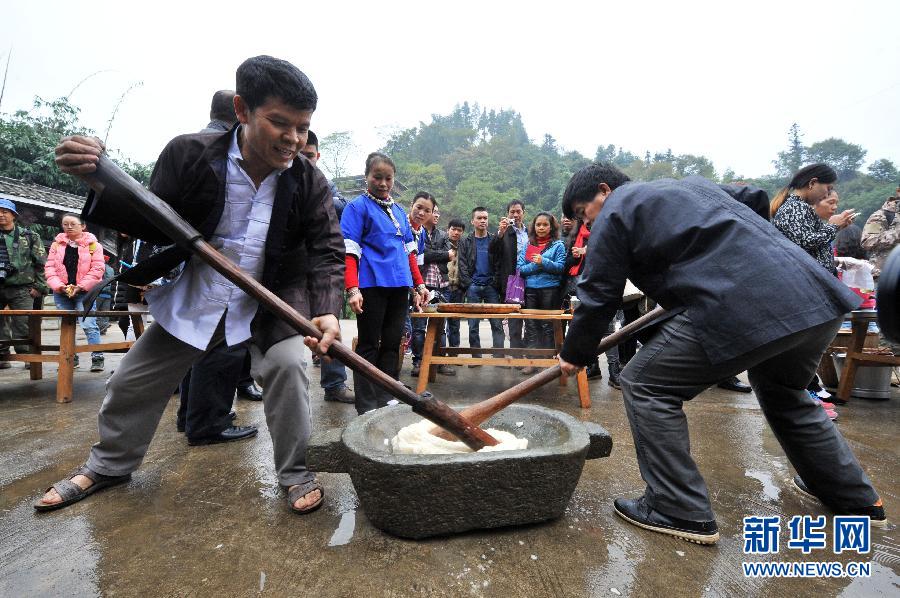 新华社照片,柳州(广西),2014年11月15日 广西三江:侗族传统“捶糍粑”吸引游客 11月15日,在广西三江侗族自治县林溪乡平岩村平寨屯,侗族群众在“捶糍粑”。当日,在广西三江侗族自治县林溪乡平岩村平寨屯,侗族群众传统民俗“捶糍粑”吸引众多游客观看、体验。第十一届中国(柳州·三江)侗族多耶节暨第三届中国大桂林·桂湘原生态民族风情节于11月15日至16日在三江举行。新华社记者 李斌 摄