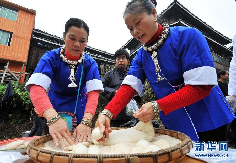 新华社照片,柳州(广西),2014年11月15日 广西三江:侗族传统“捶糍粑”吸引游客 11月15日,在广西三江侗族自治县林溪乡平岩村平寨屯,侗族妇女在做“糍粑”。当日,在广西三江侗族自治县林溪乡平岩村平寨屯,侗族群众传统民俗“捶糍粑”吸引众多游客观看、体验。第十一届中国(柳州·三江)侗族多耶节暨第三届中国大桂林·桂湘原生态民族风情节于11月15日至16日在三江举行。新华社记者 李斌 摄