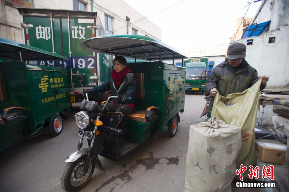 11月18日,山西太原,中国邮政公司后勤部门的女职员客串快递员在派送快递。随着“双十一”后快递派件最高峰来临。不少快递公司抽调办公室的职员帮忙派件,其中不乏女职员。中新社发 张云 摄