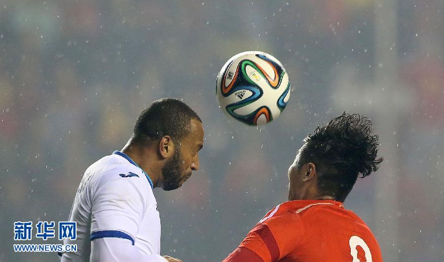 11月18日,洪都拉斯队球员维克多·贝纳德斯(左)与中国队球员韩鹏在比赛中争顶。当日,在陕西省体育场进行的国际足球友谊赛中,中国国家男子足球队以0比0战平洪都拉斯队。 新华社记者曹灿摄