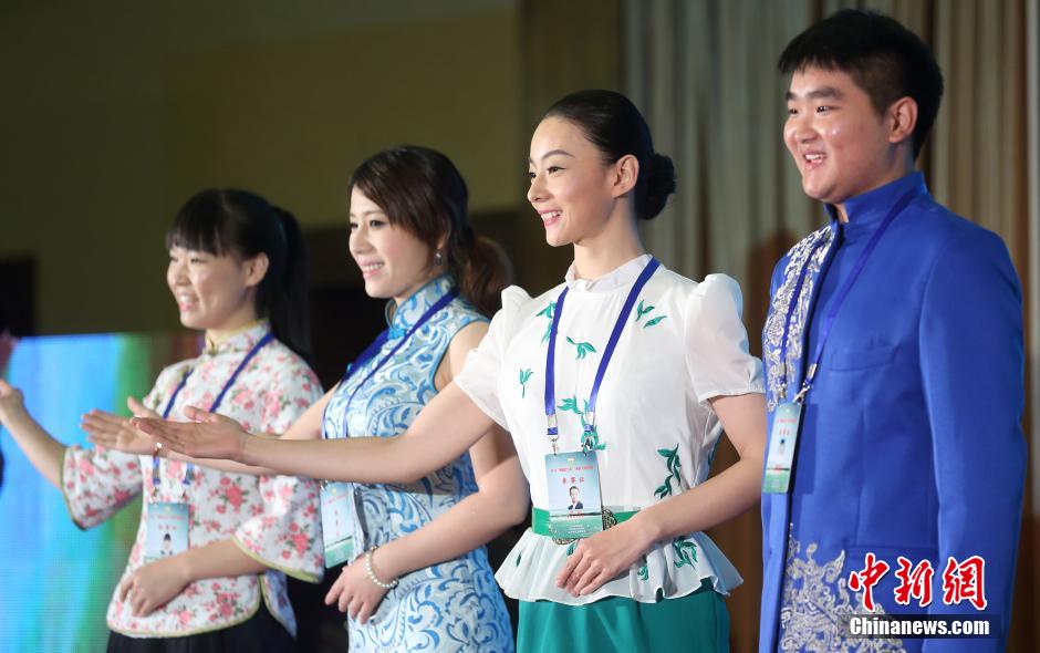 11月25日,参赛导游进行风采展示。当日,2014“畅游江苏”导游大赛在南京举行,来自无锡、淮安、连云港、南京等地选拔而出的66名选手依次走上舞台,进行导游风采、导游讲解、知识问答、才艺展示、情景再现等多个项目的比赛。据悉,由江苏省旅游局、团省委、省妇联联合主办的该项赛事,旨在激励导游提高技能水平、文化底蕴和综合素质,交流导游工作经验、提升导游社会形象,比技能、赛服务、展风采,优胜选手还将代表江苏省参加全国导游大赛。中新社发 泱波 摄