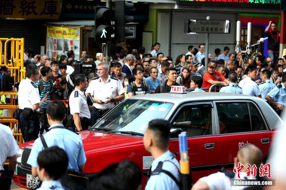 11月25日上午,香港法庭执达主任到达旺角亚皆老街,向在场人士宣布执行禁制令,并清除非法障碍物,现场大批警员戒备协助。图为当天下午亚皆老街西向通车。中新社发 洪少葵 摄
