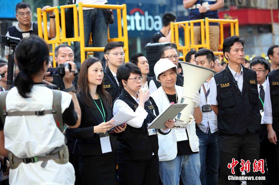 11月25日上午,香港法庭执达主任到旺角亚皆老街宣布执行禁制令,移除非法障碍物,警方到场协助。警方表示,如有任何人阻挠或冲击执达主任,警方会果断执法。 中新社发 洪少葵 摄