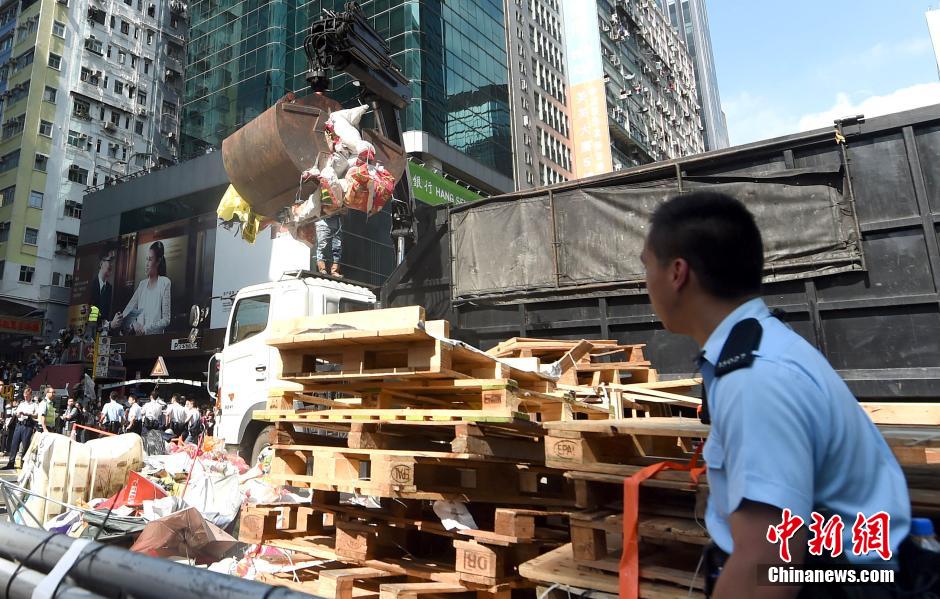 11月25日,香港法庭执达主任到达旺角亚皆老街,向在场人士宣布执行禁制令,清除非法障碍物,现场大批警员戒备。 中新社发 张宇 摄