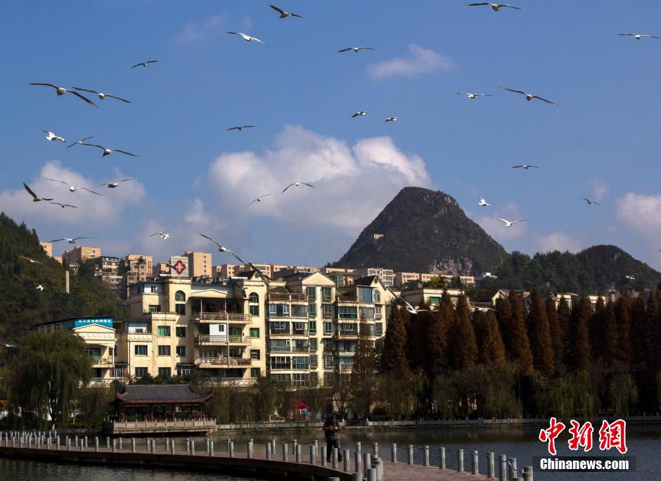 近日,在贵州六盘水市区中心的明湖湿地公园,成群的红嘴鸥时而飞翔,时而觅食,成为公园一景,吸引了大批市民前来观赏喂食。 中新社发 杨展凌 摄