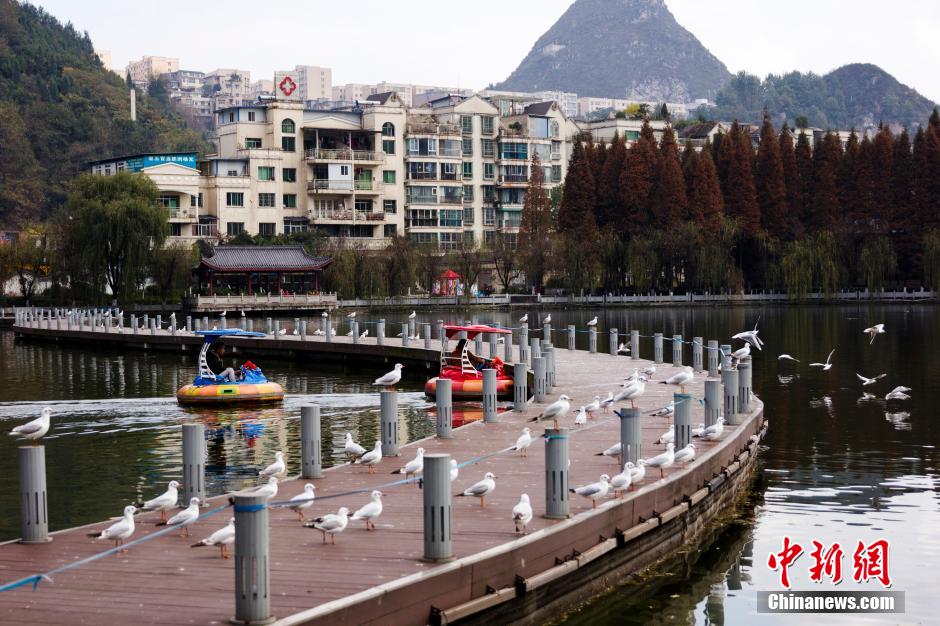 近日,在贵州六盘水市区中心的明湖湿地公园,成群的红嘴鸥时而飞翔,时而觅食,成为公园一景,吸引了大批市民前来观赏喂食。 中新社发 杨展凌 摄