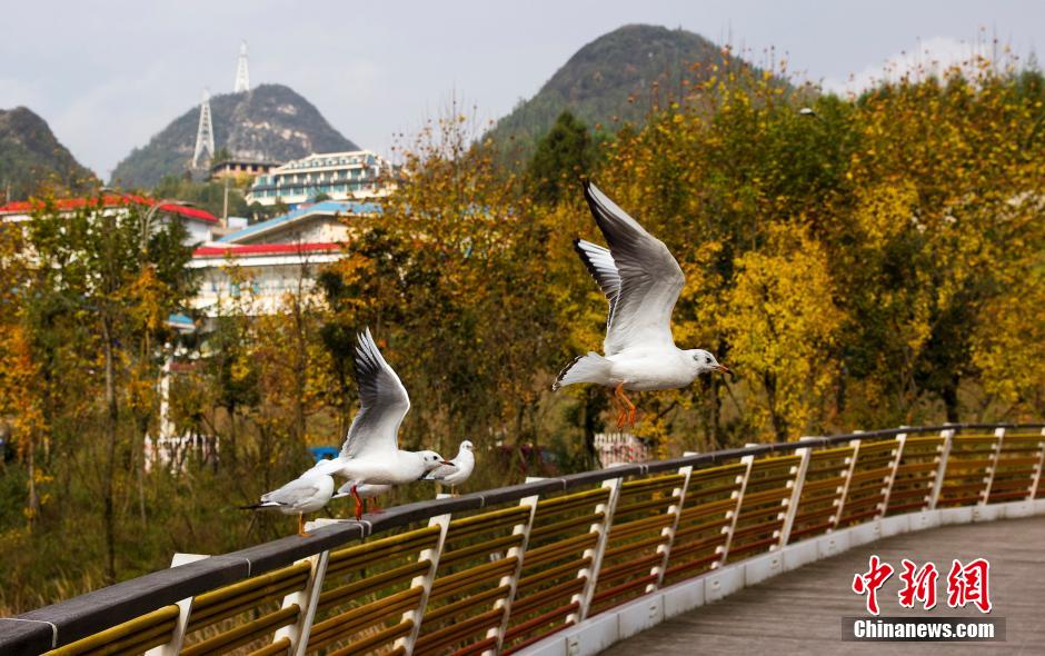 近日,在贵州六盘水市区中心的明湖湿地公园,成群的红嘴鸥时而飞翔,时而觅食,成为公园一景,吸引了大批市民前来观赏喂食。 中新社发 杨展凌 摄