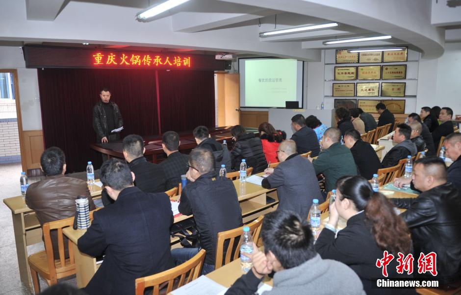11月25日,40余名火锅企业老板报名参加了重庆火锅学院第一堂理论培训课,这也是火锅学院开学前的一次模拟实战培训。据悉,重庆火锅学院由重庆市火锅协会、重庆市烹饪协会和重庆现代职业技师学院联合筹建,2015年春季正式开学。图为重庆火锅学院第一堂理论培训课现场。陈超 摄