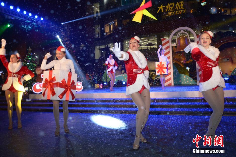 2014年11月25日,北京朝阳大悦城携手阿根廷著名插画师Javier Gonzalez Burgos打造的“怪诞森林奇遇记”大型圣诞景观盛大亮灯。亮灯仪式现场,绚烂的歌舞和斑斓的灯光让现场的观众大饱眼福,为初寒的冬日带来了拉丁童话的温暖。据悉,这一活动首次将拉美风格的主题景观装饰引入京城,通过对平面插画的立体还原,全景展现一个富于幻想和童话色彩的“怪诞森林”。本次主题景观将跨越圣诞、新年、春节三大档期,为京城市民呈现一场超越想象的文化和视觉盛宴。 中新社发 李行 摄