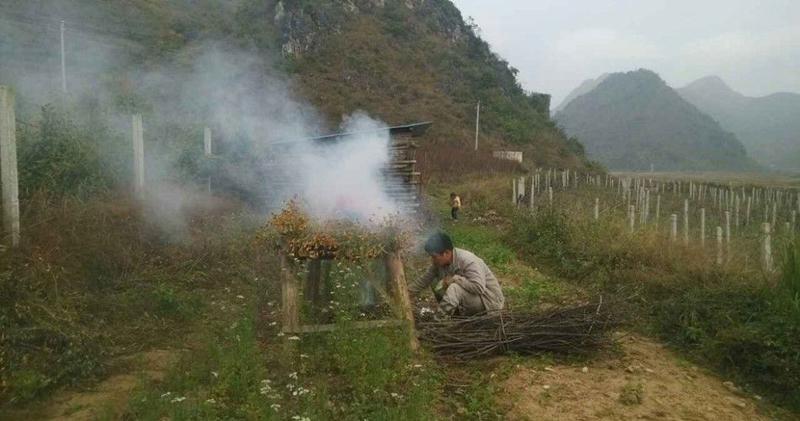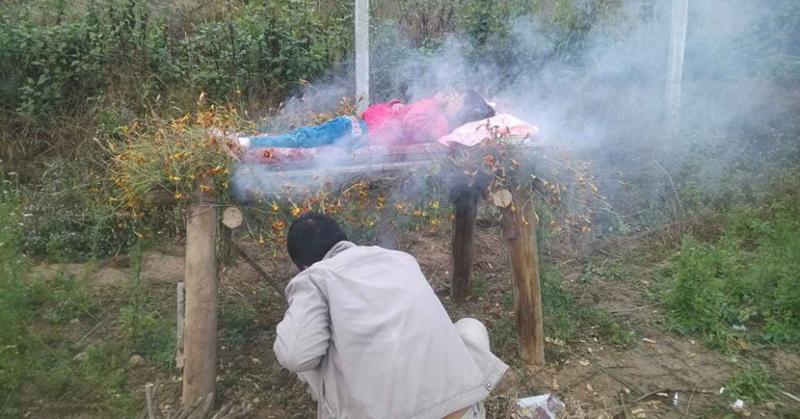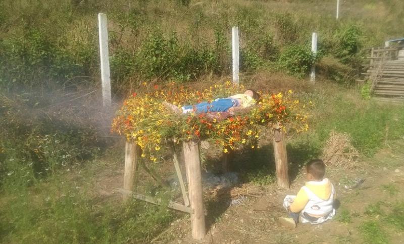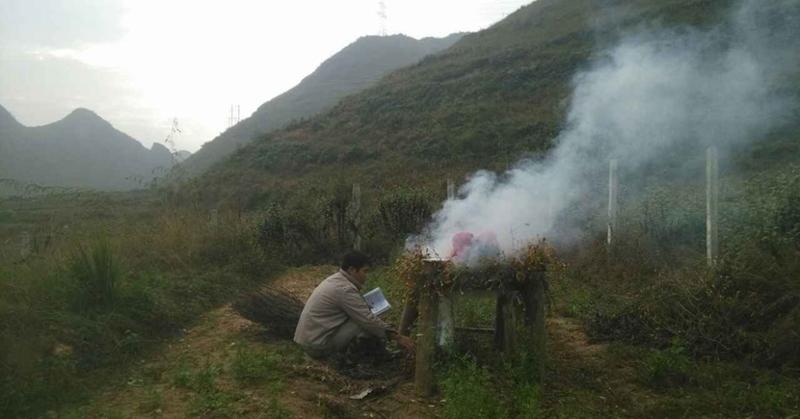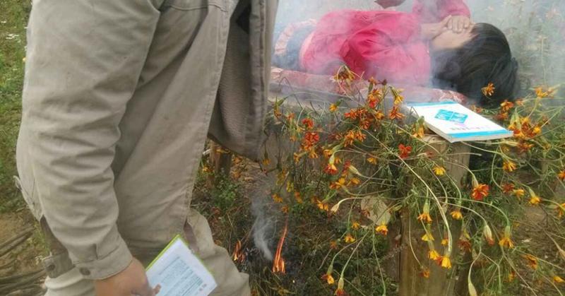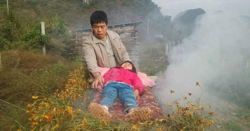 由于担心安全问题,韦树福便在自家的空地上搭建了一张草药床,他打算让女儿躺在上面,下面燃烧草药,以此来熏女儿。韦树福带着女儿来到昨天搭建草药床的空地里,拿出昨天下午上山采挖回来的草药,开始做火熏治疗。很快,草药燃烧出来的浓烟盖过了躺在草药床上的女儿。图片来源:四川新闻网