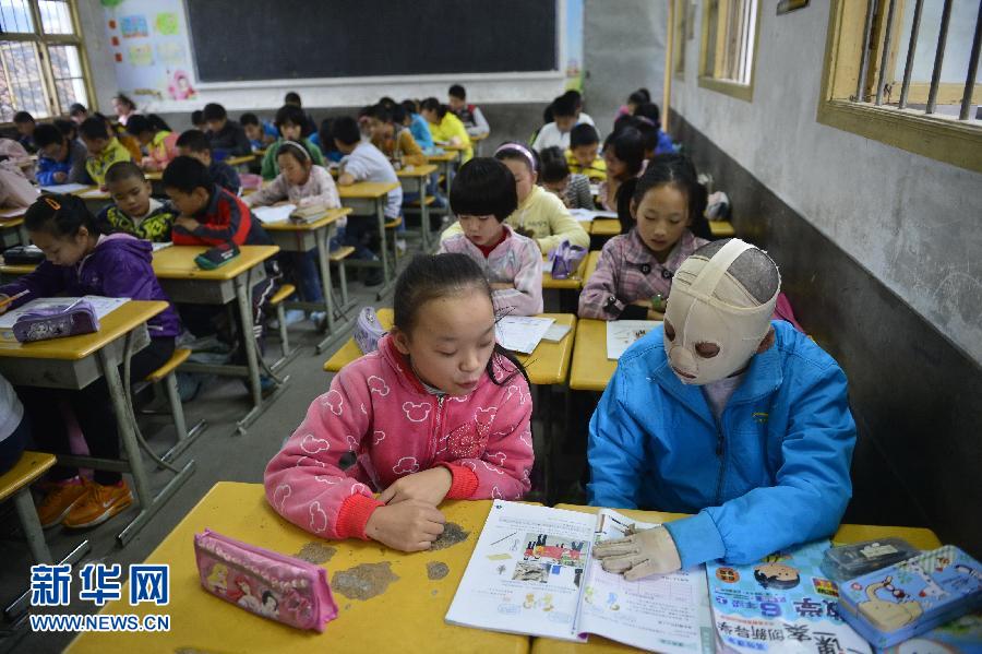 周涛戴着厚厚的弹力套上课学习(11月5日摄)。 13岁,正是一个充满幻想、憧憬未来的年龄。然而,深3级的烧伤程度,让13岁的少年周涛终日带着白色头套,并一度面临着绝望与死亡。周涛住在江西遂川县泉江镇洋村,是遂川荧屏小学六年级的学生,在今年3月一场意外事故中脸和手脚等部位严重烧伤。出院后,日常的护理和康复训练成了周涛和母亲张梅兰每天的必修课今年9月,还在康复中的周涛坚持要上学。由于耽误了半年,他只得重读一次六年级。班主任冯玉梅告诉记者,周涛依然是个开朗的孩子,老师和同学们也没有因为他的受伤而区别对待。最近一次考试,周涛还考了班上第一名,同学们都对他刮目相看。在一篇作文里,周涛这样写道:“谢谢你,妈妈!这半年多来,你像照顾婴儿一样地照顾我,让我不被细菌感染。因为你的爱,我活了下来。因为你的爱,我必须坚强!” 新华社记者周密摄
