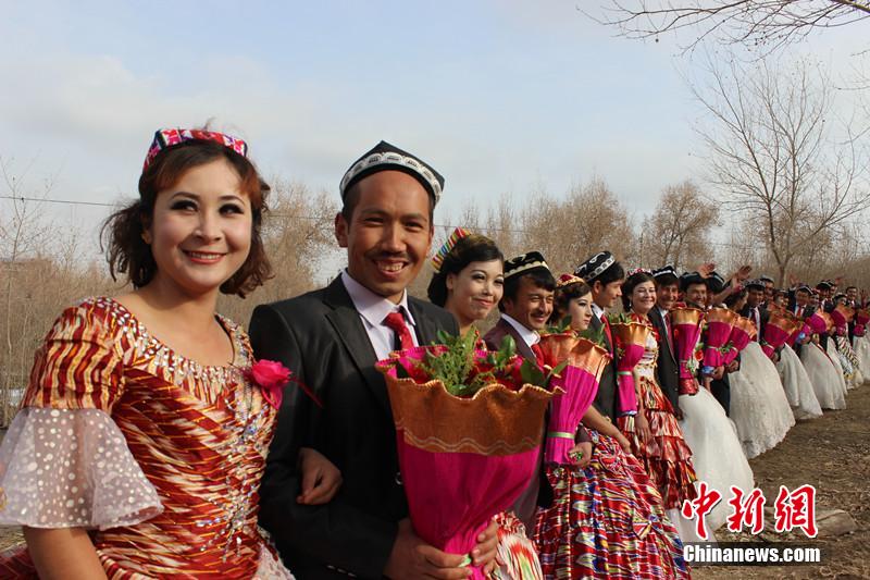 当日,岳普湖县铁热木乡18位新郎身着西装,手捧玫瑰花迎接心上的古丽;新娘穿着艾得莱丝婚纱与新郎的手臂相挽,坐上精心装扮的马车巡游,之后举行结婚典礼,并与前来祝贺的乡亲一起跳起麦西来甫。据悉,当日前来祝贺的乡亲有3000人。 张胜开 摄