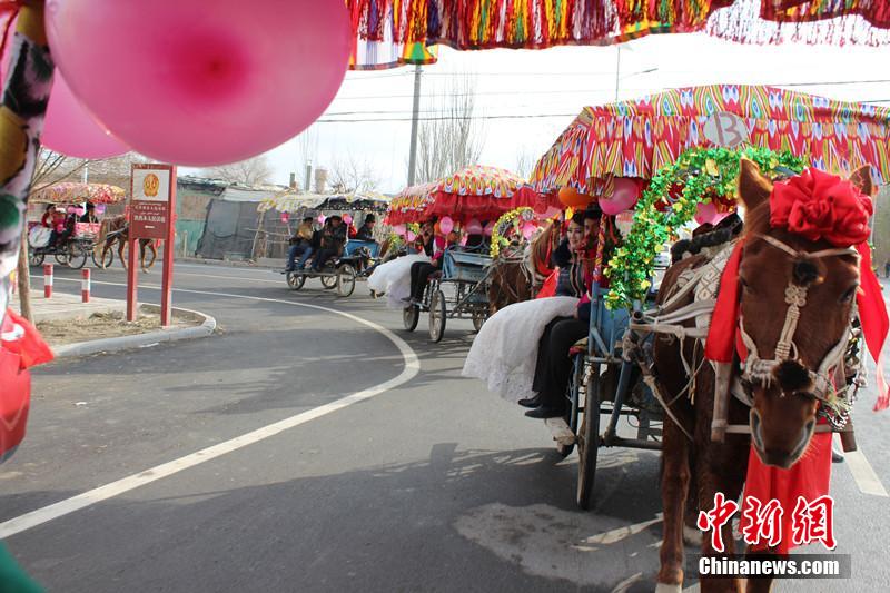 图为18对新人坐上精心装扮的马车巡游。 张胜开 摄