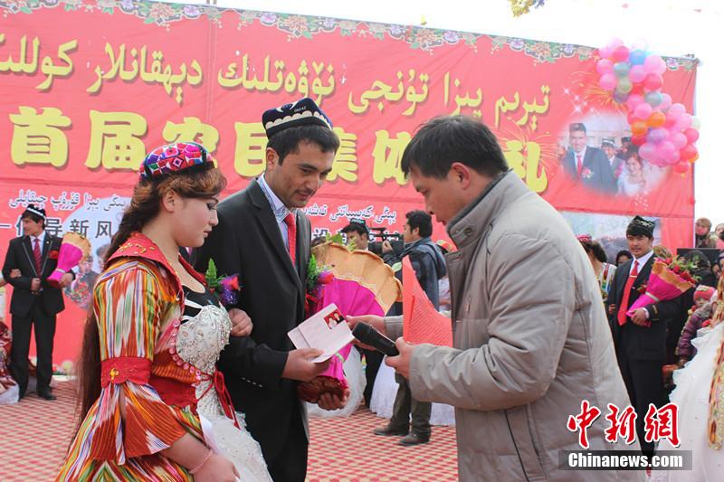 图为乡上工作人员给18对新人颁发结婚证书。 张胜开 摄