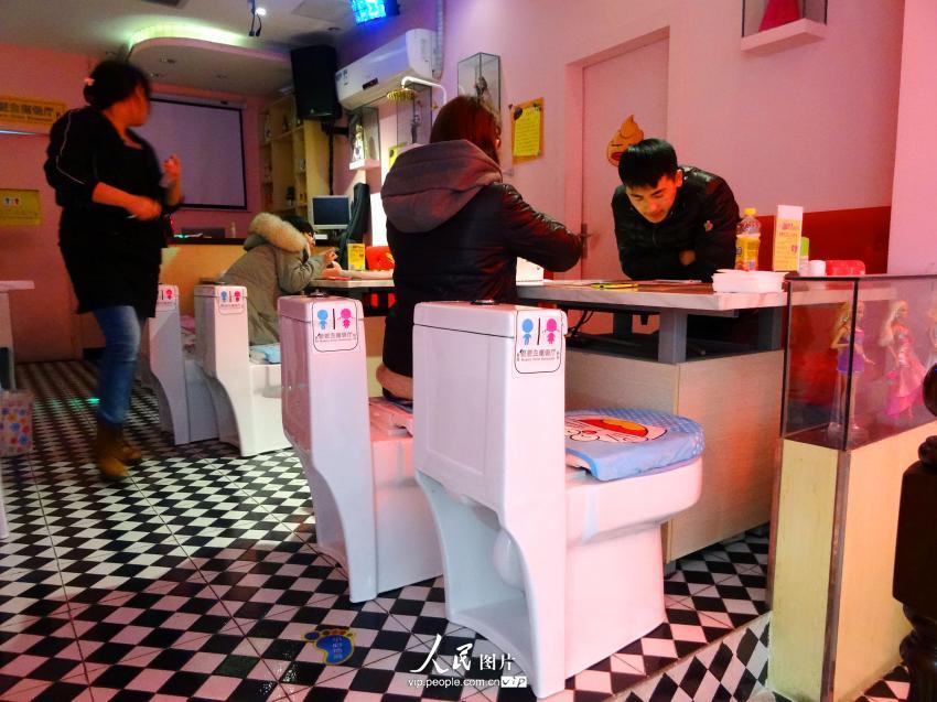 总说明:2014年12月1日,南京新街口,一些年轻人在“便所”主题餐厅里品尝“便餐”。