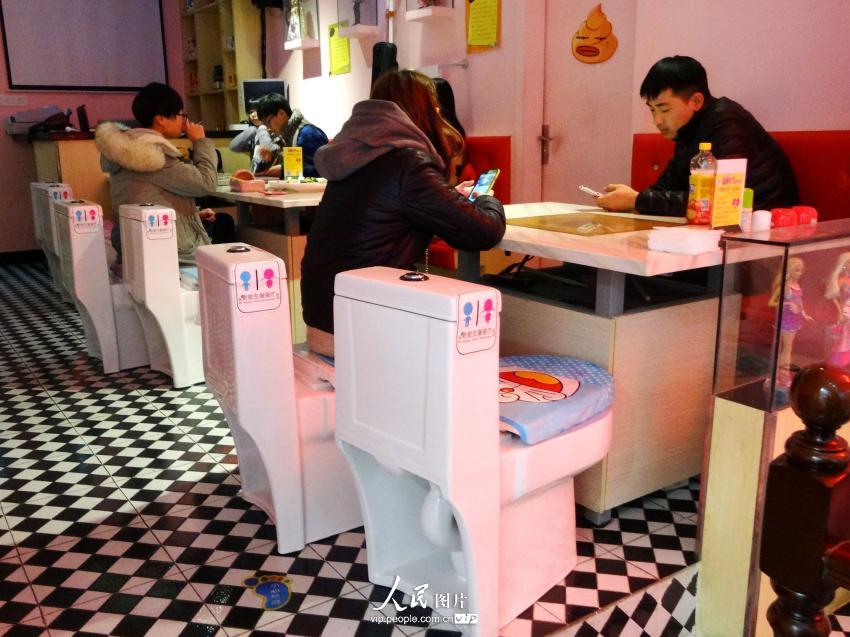 总说明:2014年12月1日,南京新街口,一些年轻人在“便所”主题餐厅里品尝“便餐”。
