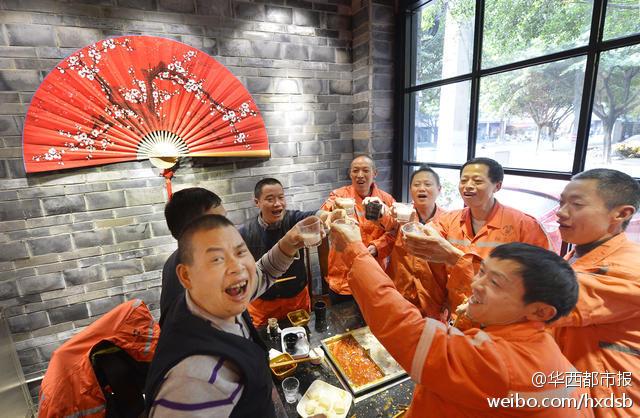 据华西都市报官方微博报道,12月4日中午,成都虽然有点寒冷,但紫竹街一家火锅店内却热火朝天。老板闭门谢客,备上好酒好菜只为招待辖区180多名环卫工。席间,服务员还与环卫工同跳“最炫民族风”。记者朱建国吴小川 图片来源:华西都市报官方微博