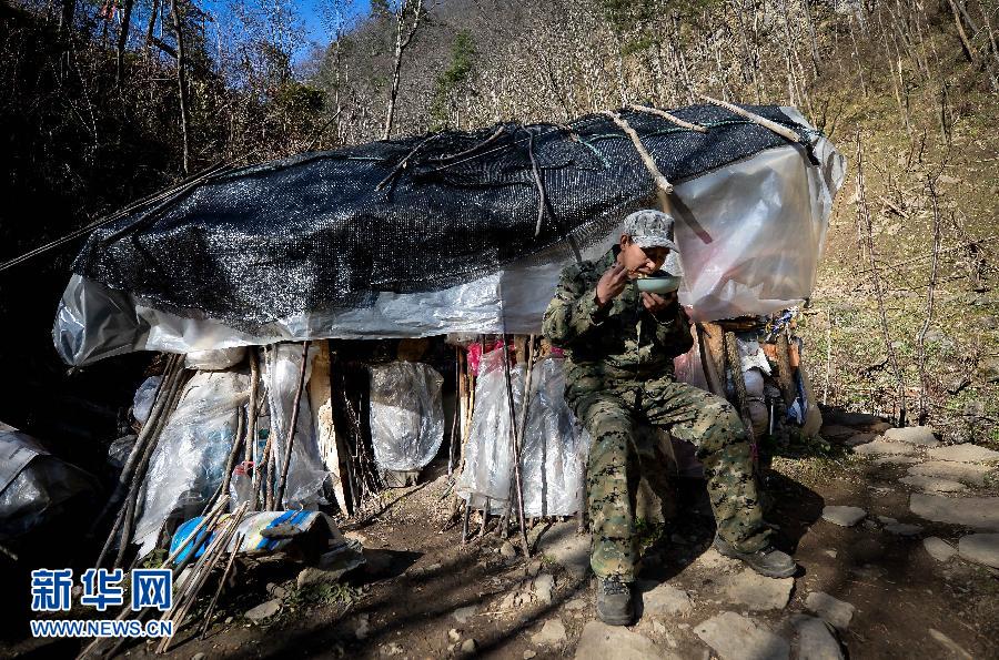 中午11点,王清晨在山上煮面条吃午饭(12月4日摄)。在陕西秦岭山中有一种职业叫“唤猴人”,他们用声音和金丝猴沟通,把深山里的金丝猴唤到开阔地,给它们投喂食物。陕西宁陕县皇冠镇朝阳沟金丝猴投食点的王清晨就是一名“唤猴人”。今年48岁的王清晨,年轻时在老家周至县给动物研究及保护机构的人员当向导,20多年来对了解野生动物的习性有自己独特的方法。2010年底王清晨开始在皇冠镇朝阳沟进行野生金丝猴的唤猴投食工作。唤猴是个技术活也是个苦差事,在花费了3个月时间不断接近了解猴群后,王清晨终于有了70多只金丝猴朋友。每天清晨5点半,王清晨就得上山深入林中找到前一天晚上猴群的栖息地,用自己独特的方法呼唤它们,将它们引向固定的投食地点。一天中的8点、13点、16点分3个时间段给金丝猴喂食,傍晚再追随着猴子们的踪迹了解猴群去向。夏秋季节山林里食物丰富,只有极少数的猴子会到投食点觅食;而冬天食物匮乏时,大部分猴子一日三餐都来投食点。虽然现在有弟弟和儿子协助自己干活,但由于猴子们只听王清晨一人的呼唤,所以一年里不管刮风下雨,王清晨几乎每天都要进山。这个职业很辛苦,但王清晨也乐在其中。据他讲,目前整个陕西的“唤猴人”也不过三四个。新华社记者刘潇摄