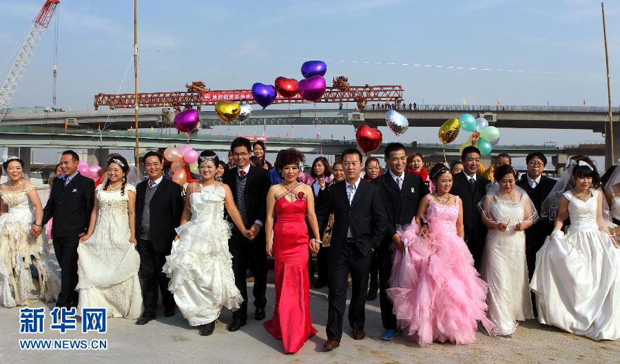 12月6日,新人们在苏州中环快速路高架桥工地上参加集体婚纱照拍摄活动。当日是中铁一局上海分公司承建的江苏省苏州市中环快速路2标工地主线桥最后一跨钢桥梁成功合龙的日子,参与工程建设的9对新人和一线建设者及家属在工地上参加“情系中环·鹊桥相会”集体婚纱拍摄活动。新华社记者张明摄