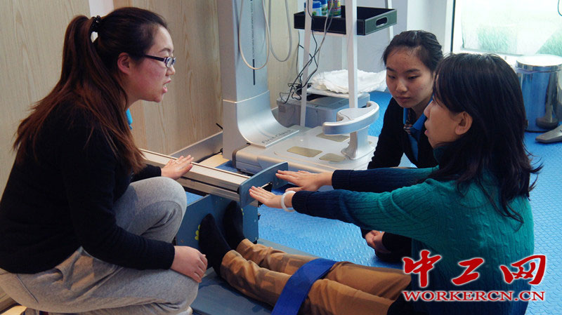 集体质监测、业务培训、数据采集、分析评估、处方研发于一体“体质促进中心”建成后每年将对4万名职工进行体质测试。图为工作人员正在讲解测试的目的。中工网记者 葛姗 摄
