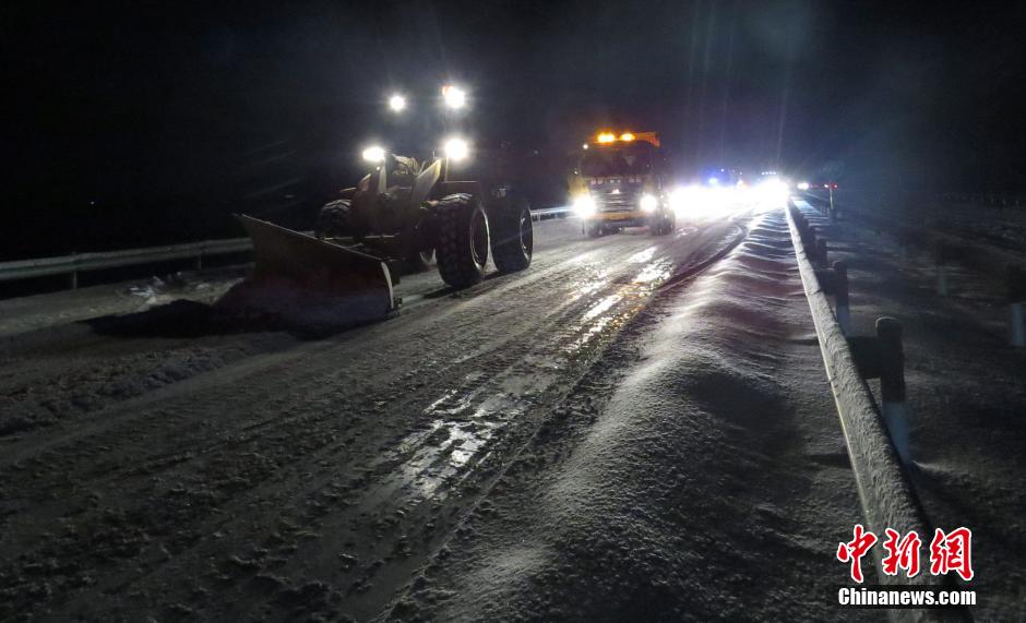 12月9日,新疆巴州地区迎来降雪,降雪量大影响道路通行,焉耆公路管理分局道路养护人员上路昼夜清雪。该辖区“和库高速公路”和硕至27团路段降雪较大,焉耆公路管理分局组织干部工人15人该应急保通除雪施工队伍连续工作二十余小时,清除了和库高速和硕至27团段路面积冰积雪,撒融雪剂九十余吨,出动机械二十余台班,截至目前,公路养护仍组织机械清除应急车道积雪。中新社发 王强 摄