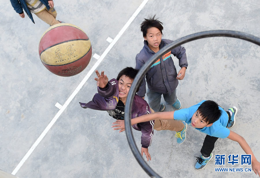 在广西大化瑶族自治县板升乡八好小学,学生们在打篮球(12月8日摄)。在广西大石山区,因受经济发展、自然环境、师资力量等条件制约,这里的部分山村学校体育教育严重“短腿”。然而,尽管条件艰苦,缺乏体育设施,没有专业老师指导,但孩子们利用山旮旯里的狭小空间,打篮球、耍足球、打乒乓球、跳绳……在童年里感受体育运动带给他们的乐趣。据悉,广西教育部门正采取多项举措,计划在未来几年改变大石山区农村小学基本办学条件薄弱的现状。在这一轮“改薄工程”中,广西正在把学校体育场地建设和设施器材配备纳入计划中,改善贫困山区孩子们的活动场所,圆山旮旯孩童们的“体育梦”。新华社记者 张爱林 摄